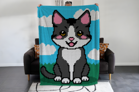 Chat noir tuxedo – patron de couverture C2C au crochet Réalisez cette magnifique couverture C2C au crochet représentant un Chat noir tuxedo. Patron PDF avec grille et instructions détaillées, parfait pour crocheteurs et crocheteuses intermédiaires. Présentation du pattern et description du motif Chat noir tuxedo – patron de couverture C2C au crochet – Afghan / …