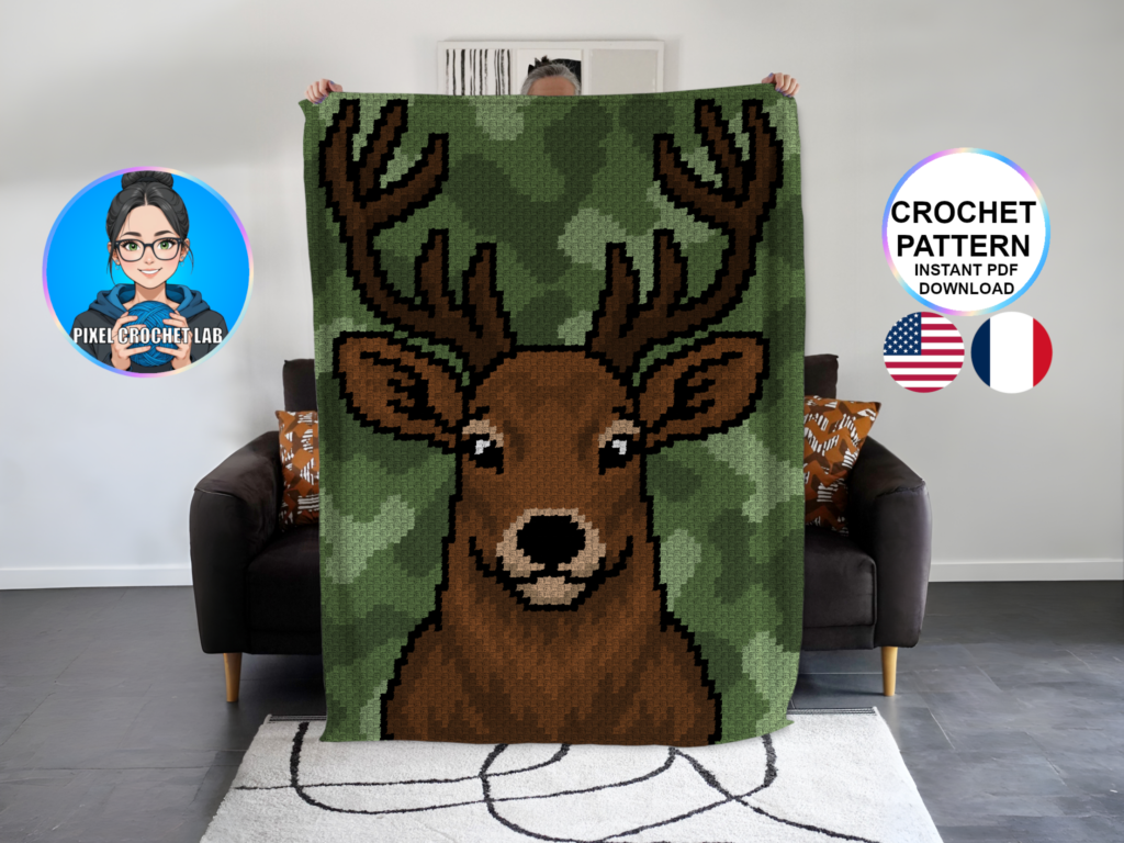 Apportez majesté et originalité à vos créations avec ce patron de couverture au crochet en point C2C mettant en scène un cerf majestueux, représenté en pixel art sur un fond camouflage aux nuances de vert. Symbole de force, de noblesse et de connexion avec la nature, ce cerf emblématique dégage une présence imposante et élégante qui donne immédiatement du caractère au design.