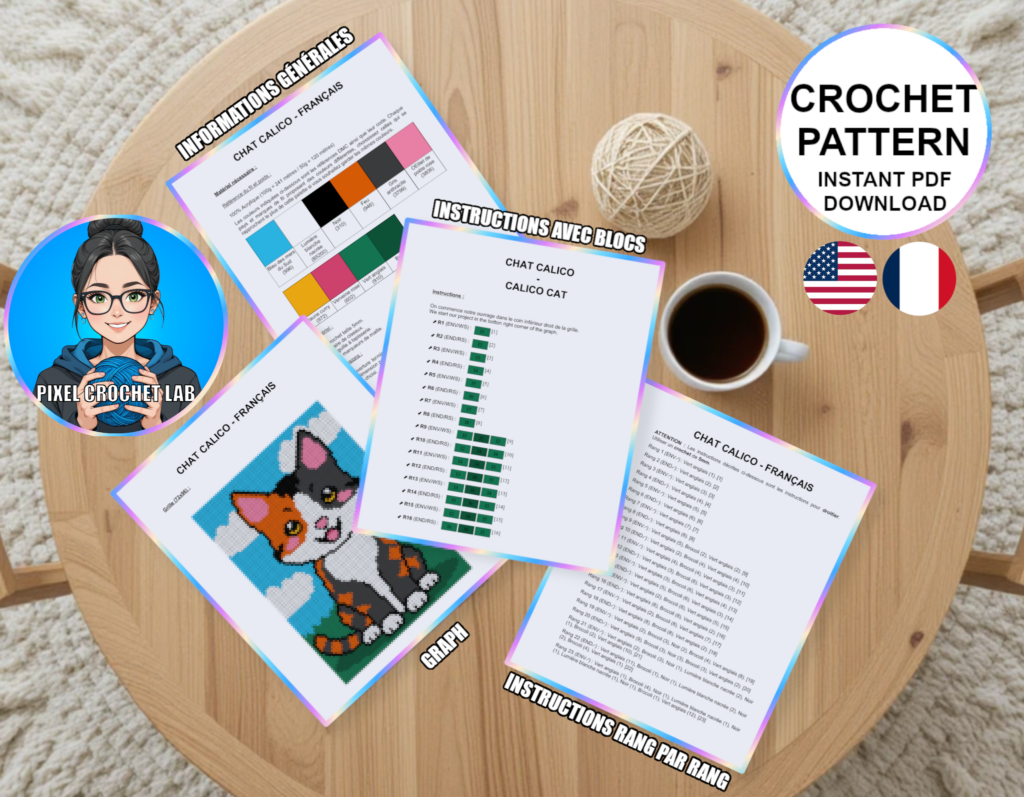 Apportez couleur et douceur à vos créations avec ce patron de couverture au crochet en point C2C mettant en scène un chat calico, représenté en pixel art assis sur l’herbe. Symbole de curiosité, de malice et de compagnie féline, ce chat emblématique dégage une présence tendre et joyeuse, qui donne immédiatement du caractère au design.