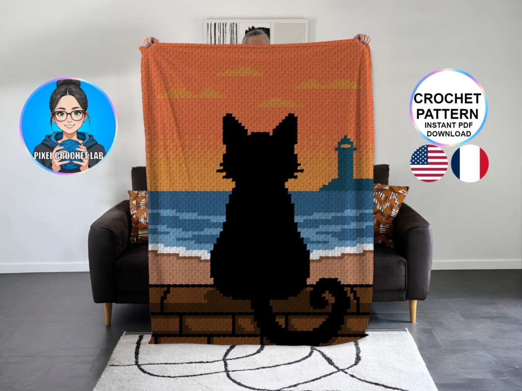 Prêt à réaliser votre couverture au crochet en C2C avec une silhouette de chat noir devant la mer ?