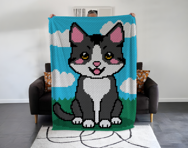 Réalisez cette magnifique couverture C2C au crochet représentant un Chat noir tuxedo. Patron PDF avec grille et instructions détaillées, parfait pour crocheteurs et crocheteuses intermédiaires.