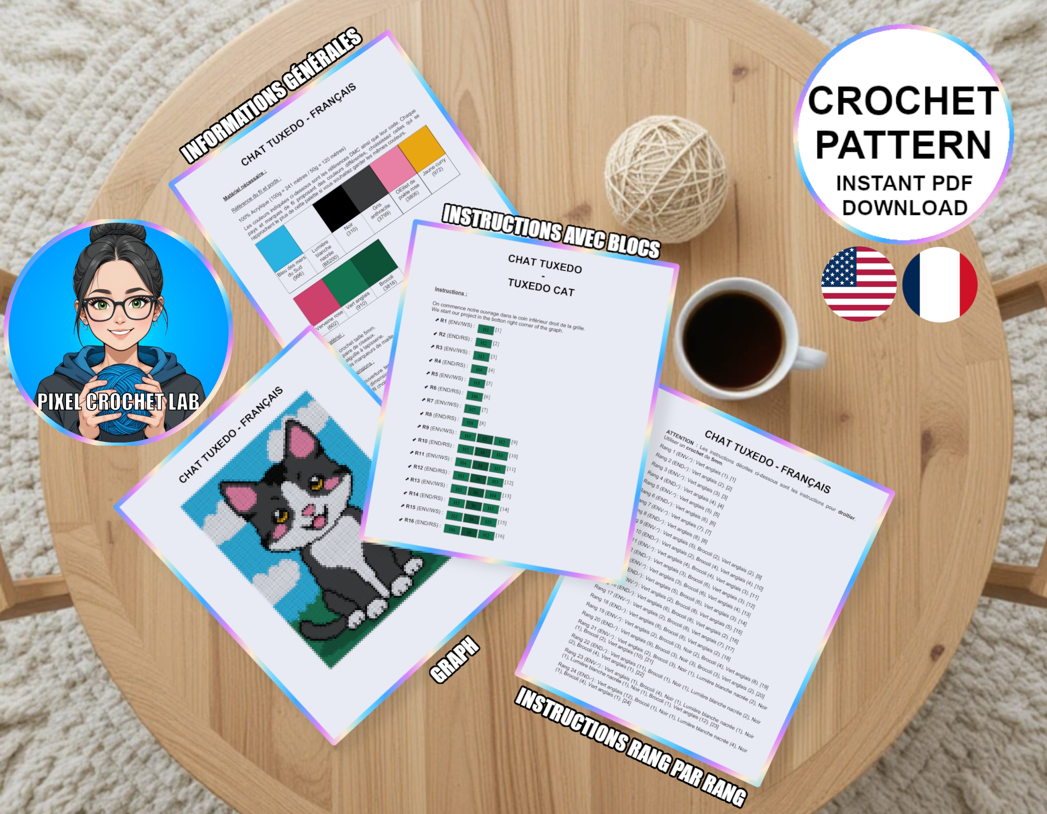 Apportez charme et élégance à vos créations avec ce patron de couverture au crochet en point C2C mettant en scène un chat noir tuxedo, représenté en pixel art assis sur l’herbe. Symbole de mystère, de douceur et de compagnie féline, ce chat emblématique dégage une présence attentive et raffinée qui donne immédiatement du caractère au design.