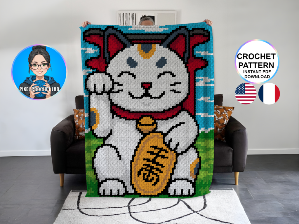 Réalisez cette magnifique couverture C2C au crochet représentant un Chat porte-bonheur Maneki Neko. Patron PDF avec grille et instructions détaillées, parfait pour crocheteurs et crocheteuses intermédiaires.