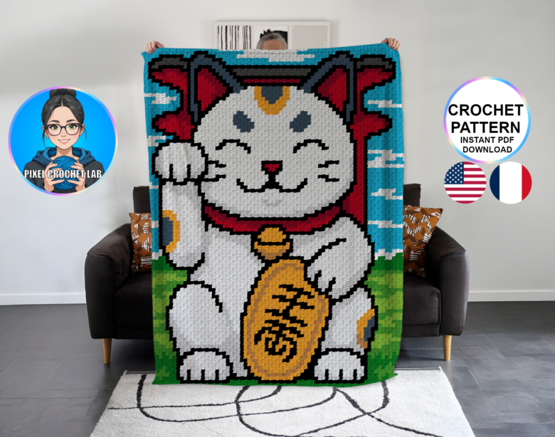 Chat porte-bonheur Maneki Neko – patron de couverture C2C au crochet – Afghan / Graphghan au style Pixel Art – Couverture Bébé, Enfant & Adulte ( format PDF) sur le thème des animaux de compagnie.