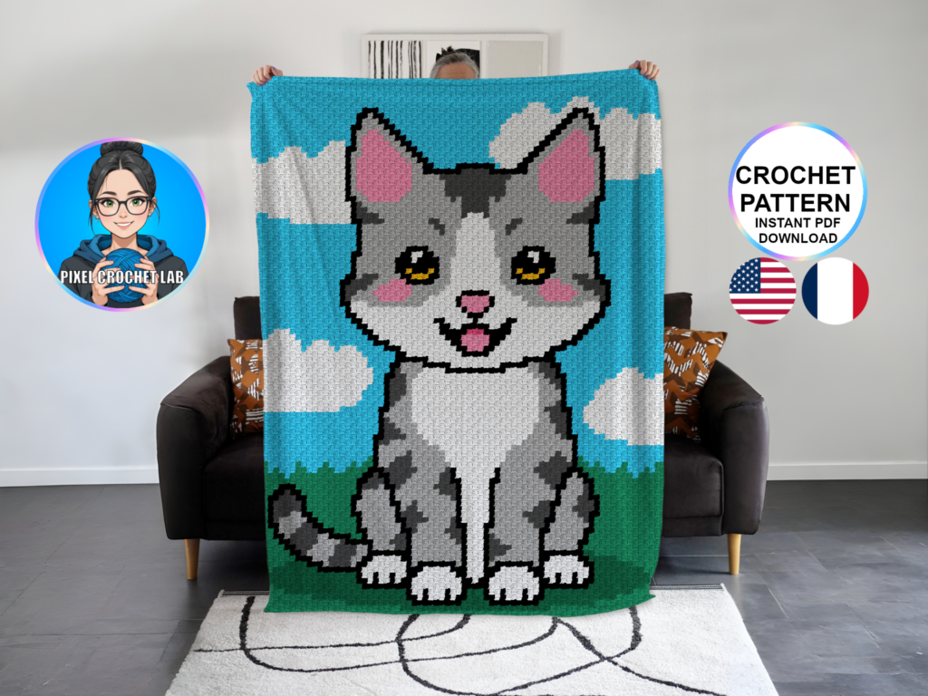Apportez douceur et charme à vos créations avec ce patron de couverture au crochet en point C2C mettant en scène un chat gris tabby, représenté en pixel art assis tranquillement sur l’herbe. Symbole de curiosité, de malice et de compagnie féline, ce chat emblématique dégage une présence tendre et attentive, qui donne immédiatement du caractère au design.