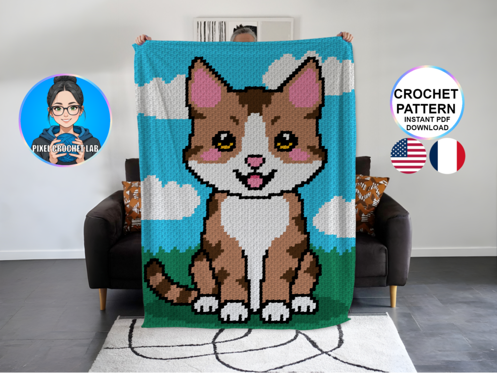 Apportez chaleur et douceur à vos créations avec ce patron de couverture au crochet en point C2C mettant en scène un chat tabby marron, représenté en pixel art assis sur l’herbe. Symbole de curiosité, de malice et de compagnie féline, ce chat emblématique dégage une présence tendre et attentive, qui donne immédiatement du caractère au design.