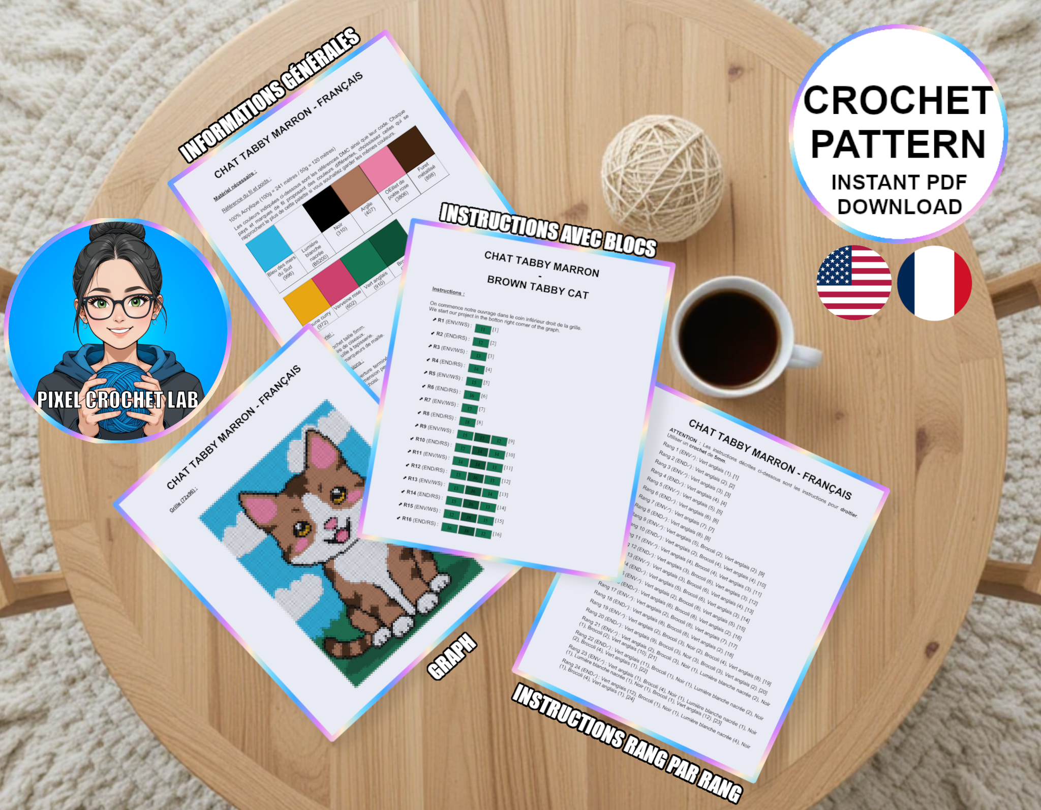 - Informations générales : couleurs utilisées, taille du crochet et type de fil employé.