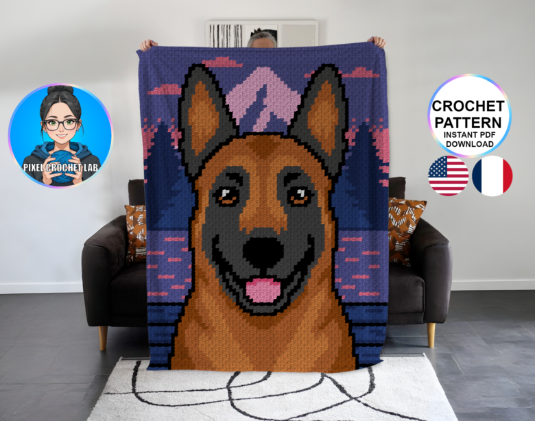 Réalisez cette magnifique couverture C2C au crochet représentant un chien de la race des Berger Belge malinois. Patron PDF avec grille et instructions détaillées, parfait pour crocheteurs et crocheteuses intermédiaires.