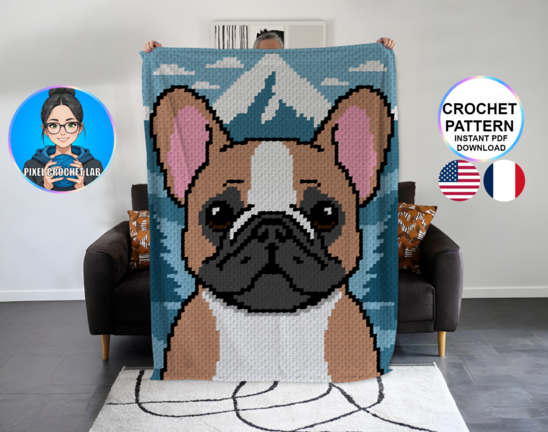 Apportez une touche de charme et de modernité à vos créations avec ce patron de couverture au crochet en point C2C représentant un Bouledogue Français, illustré en pixel art dans un décor naturel apaisant. Reconnu pour son tempérament affectueux, sociable et plein de personnalité, ce chien emblématique dégage une présence à la fois attachante et expressive, idéale pour un projet crochet au style affirmé et contemporain.