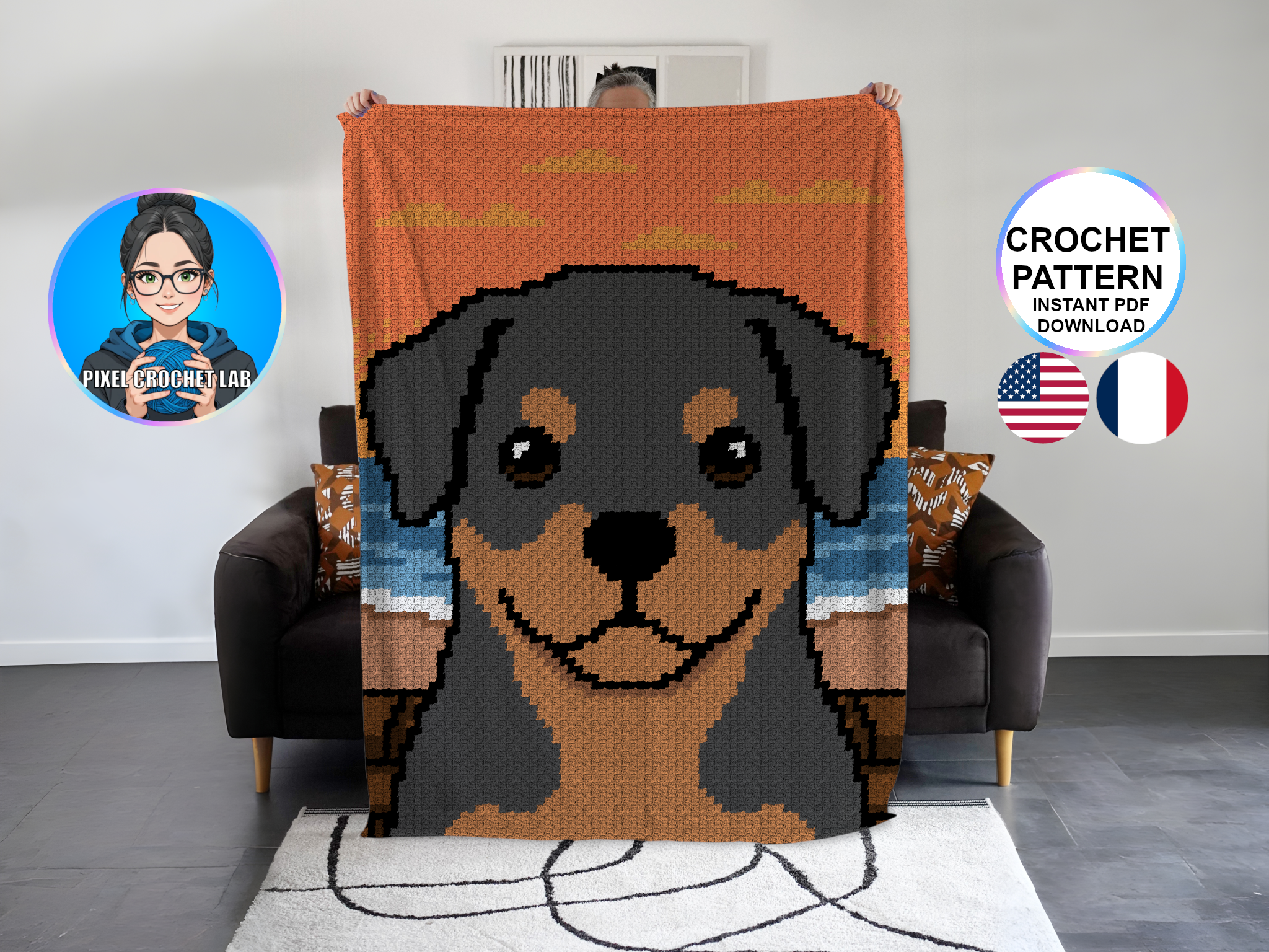Réalisez cette magnifique couverture C2C au crochet représentant un chien rottweiler. Patron PDF avec grille et instructions détaillées, parfait pour crocheteurs et crocheteuses intermédiaires.