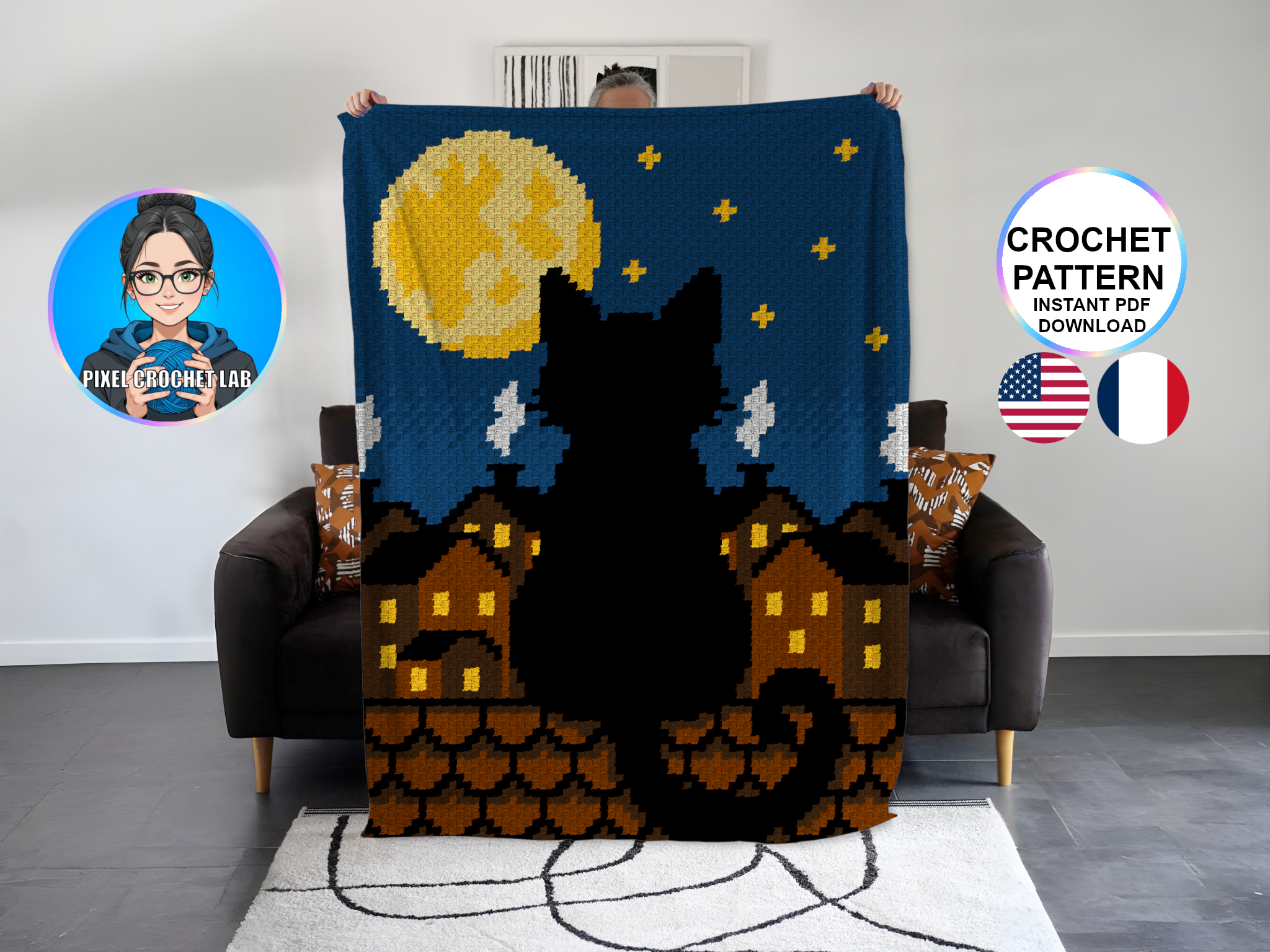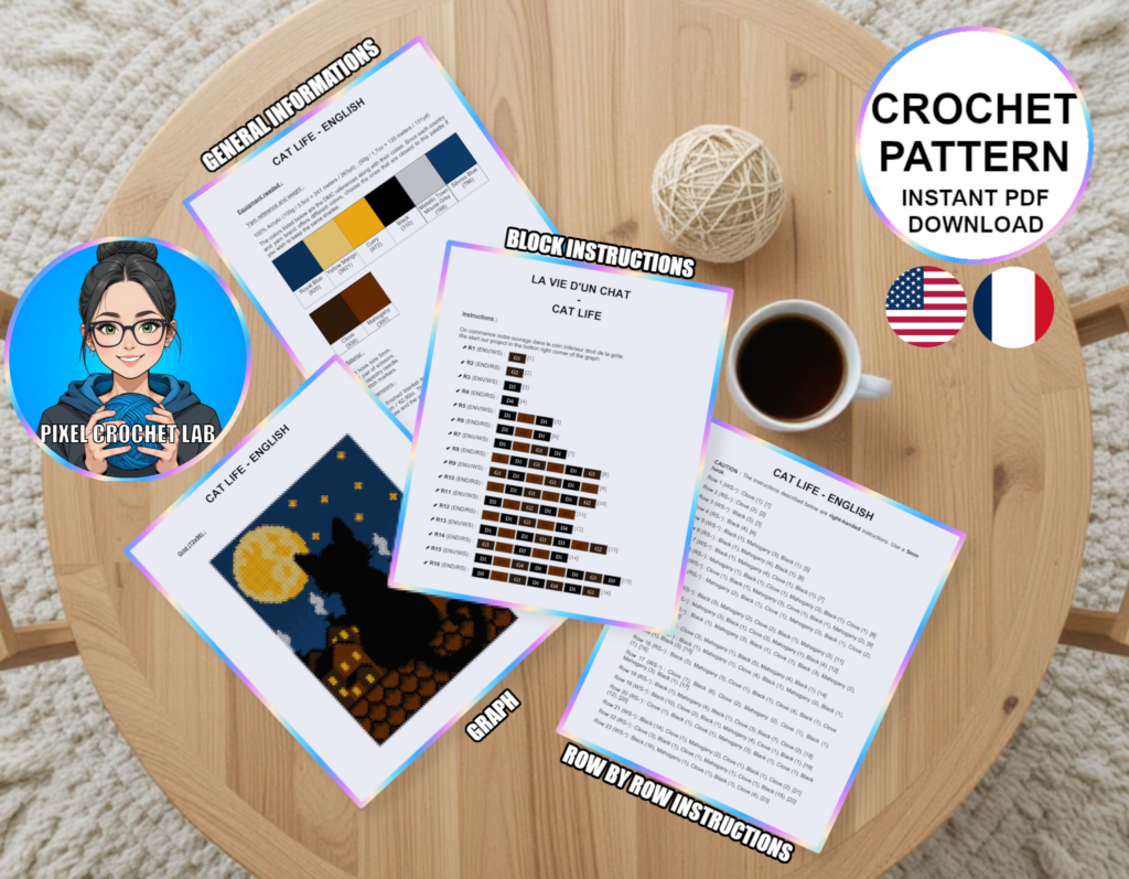 Bring mystery and poetry to your creations with this C2C crochet blanket pattern featuring the silhouette of a black cat, depicted in pixel art sitting on the rooftops of a nocturnal city. Gazing at the moon, the stars, and the illuminated city below, this cat radiates a calm and dreamy presence, instantly creating a peaceful and contemplative atmosphere.
