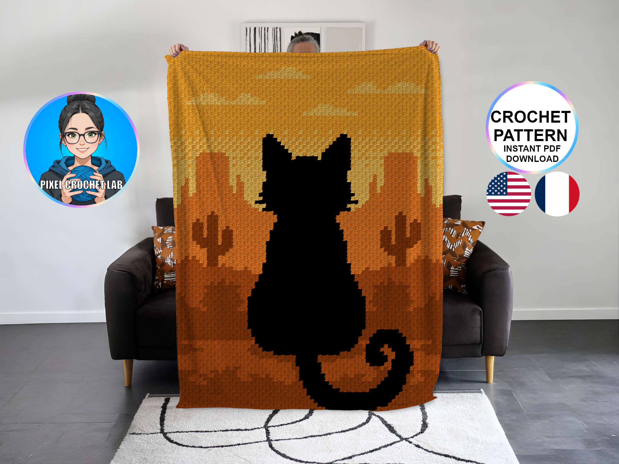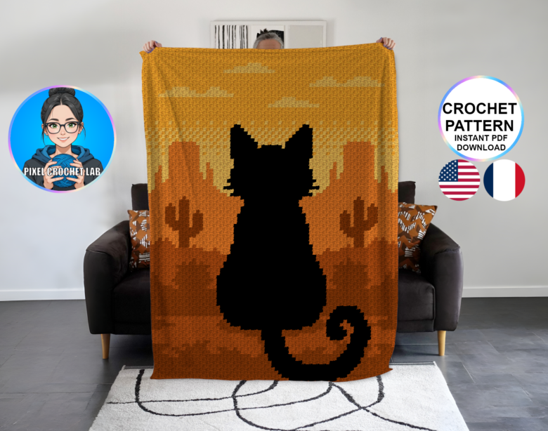 Bring charm and power to your creations with this C2C crochet blanket pattern featuring the silhouette of a black cat, depicted in pixel art sitting in front of an American canyon/desert with gradients of yellow and orange. This contemplative scene radiates a warm, strong, and soothing atmosphere, inviting reflection and wonder.