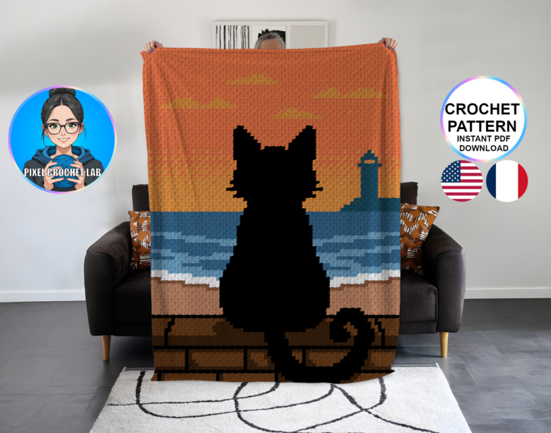 Bring serenity and poetry to your creations with this C2C crochet blanket pattern featuring the silhouette of a black cat, depicted in pixel art sitting on a low wall facing a peaceful beach and a calm sea at sunset. This contemplative scene radiates a soothing and luminous atmosphere, inviting relaxation and reflection.
