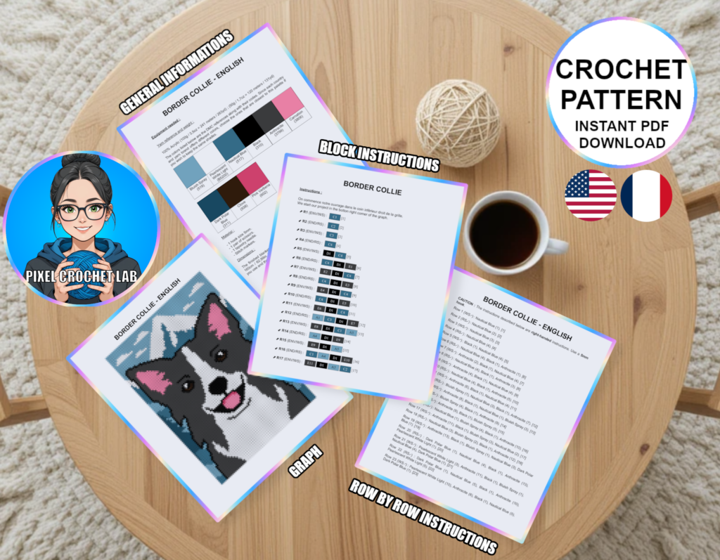 Bring dynamism and elegance to your creations with this C2C crochet blanket pattern featuring a Border Collie, illustrated in pixel art within an inspiring natural setting. Known for its remarkable intelligence, energy, and attentive gaze, this iconic dog radiates a lively and expressive presence that instantly adds character to the design.