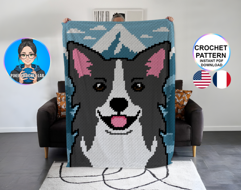 Bring dynamism and elegance to your creations with this C2C crochet blanket pattern featuring a Border Collie, illustrated in pixel art within an inspiring natural setting. Known for its remarkable intelligence, energy, and attentive gaze, this iconic dog radiates a lively and expressive presence that instantly adds character to the design.