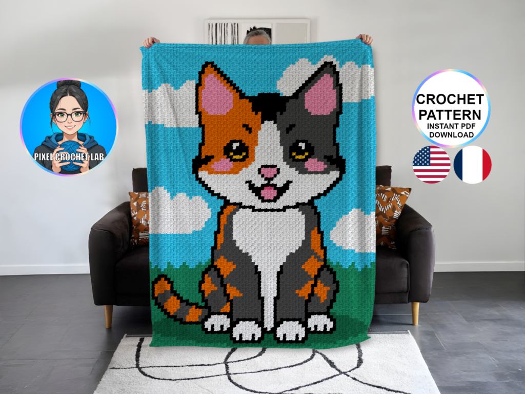 Bring color and softness to your creations with this C2C crochet blanket pattern featuring a calico cat, depicted in pixel art sitting on the grass. A symbol of curiosity, playfulness, and feline companionship, this iconic cat radiates a tender and joyful presence that immediately adds character to the design.