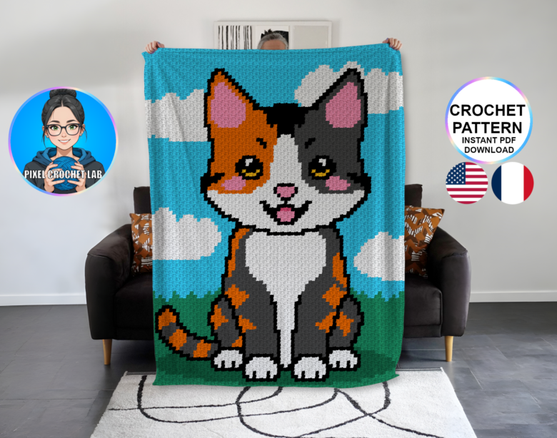Bring color and softness to your creations with this C2C crochet blanket pattern featuring a calico cat, depicted in pixel art sitting on the grass. A symbol of curiosity, playfulness, and feline companionship, this iconic cat radiates a tender and joyful presence that immediately adds character to the design.