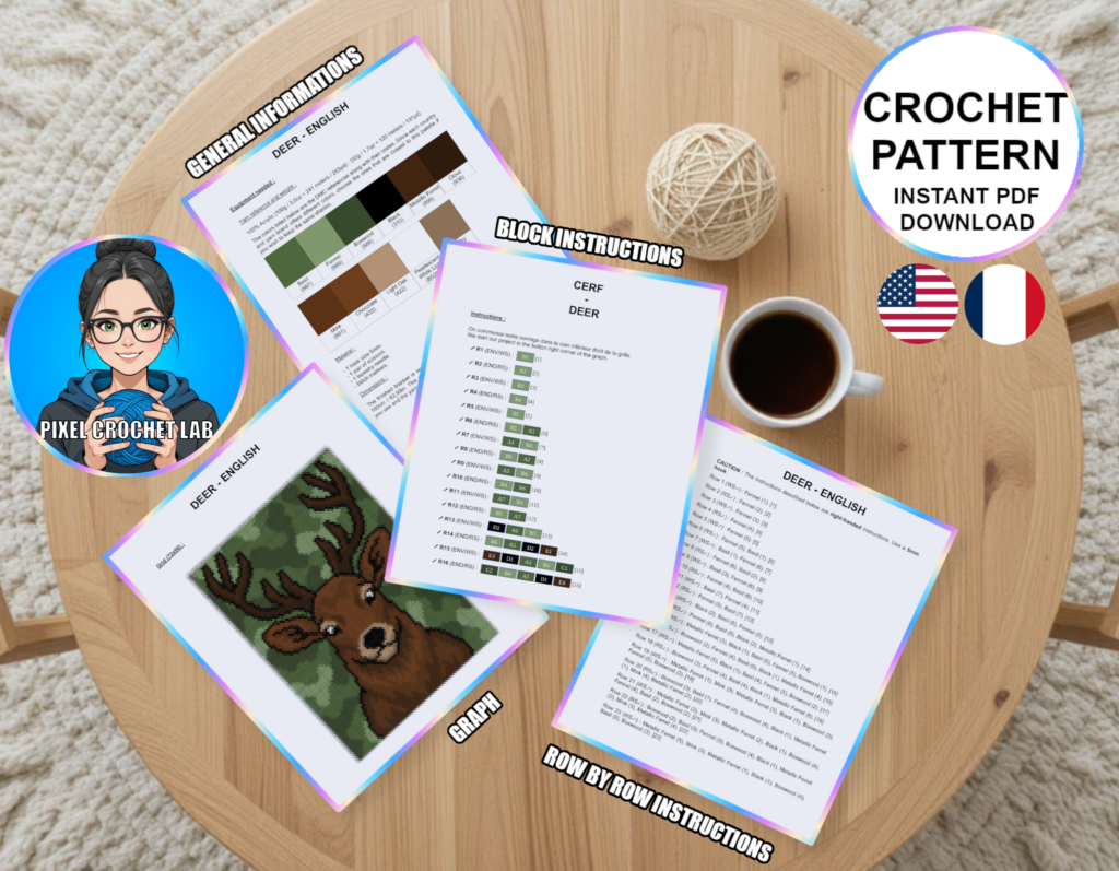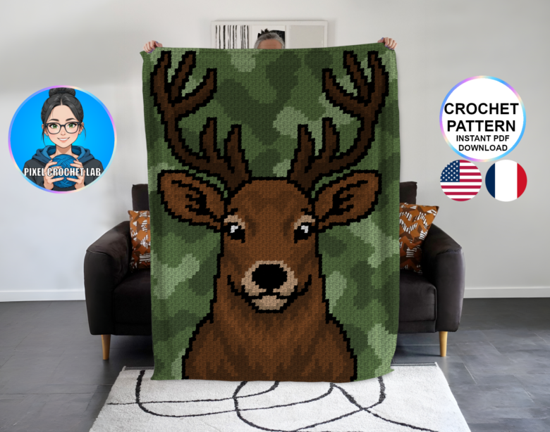 Bring majesty and originality to your creations with this C2C crochet blanket pattern featuring a majestic stag, depicted in pixel art on a camouflage background in shades of green. A symbol of strength, nobility, and connection with nature, this iconic stag exudes an imposing and elegant presence that immediately adds character to the design.