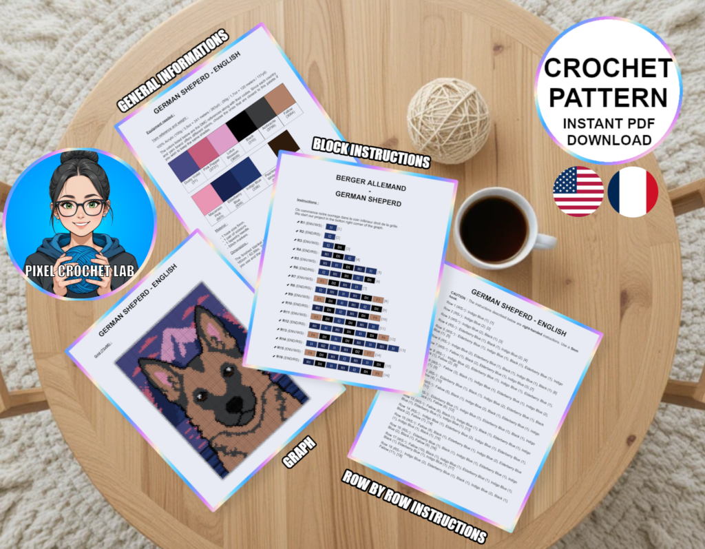 German Shepherd dog – C2C Crochet Blanket Pattern – Afghan / Graphghan in Pixel Art Style – Baby, Child & Adult Blanket (PDF format)