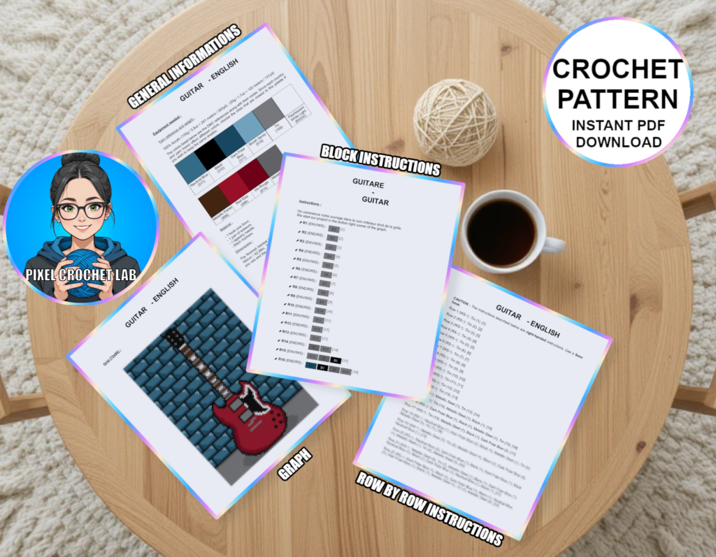 Bring a dose of power, legendary riffs, and pure energy to your creations with this C2C crochet blanket pattern featuring a Mythical Electric Guitar, depicted in pixel art. A symbol of pure Hard Rock, fiery solos, and rebellion, this legendary instrument—which gave birth to the greatest rock classics—exudes a charismatic and indomitable presence, instantly giving a unique soul and strength to the design.