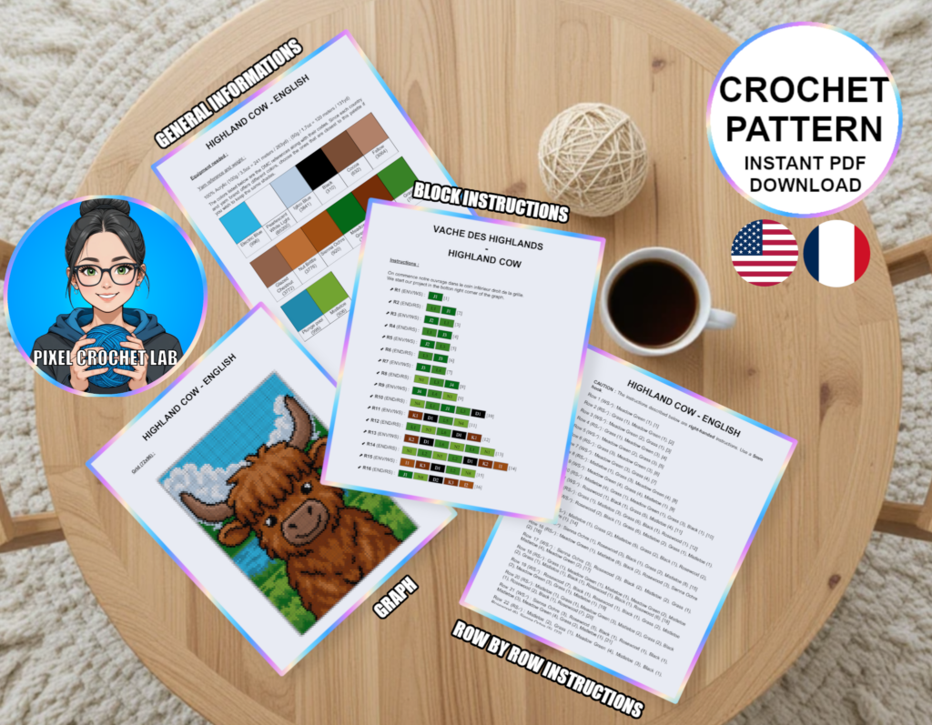 Give character to your projects with this C2C Crochet Blanket Pattern featuring a Highland Cow, depicted in pixel art within a serene natural setting. The strong lines of the motif and balanced contrasts create a striking visual design, perfect for a blanket or throw that is both original and refined.