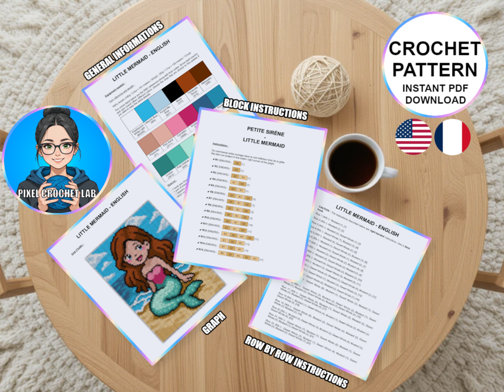 Bring a touch of sweetness and wonder to your creations with this C2C crochet blanket pattern featuring a Little Mermaid, depicted in an adorable pixel art style. A symbol of dreams, freedom, and marine magic, this charming mermaid exudes a joyful and soothing presence, marked by her radiant smile.