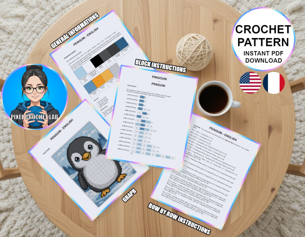 Designed to combine the joy of creation with striking visual impact, this PDF pattern will appeal to crochet enthusiasts, penguin lovers, and pixel art fans. Easy to adapt in size (by changing the yarn thickness), it is suitable for baby, child, or adult projects.