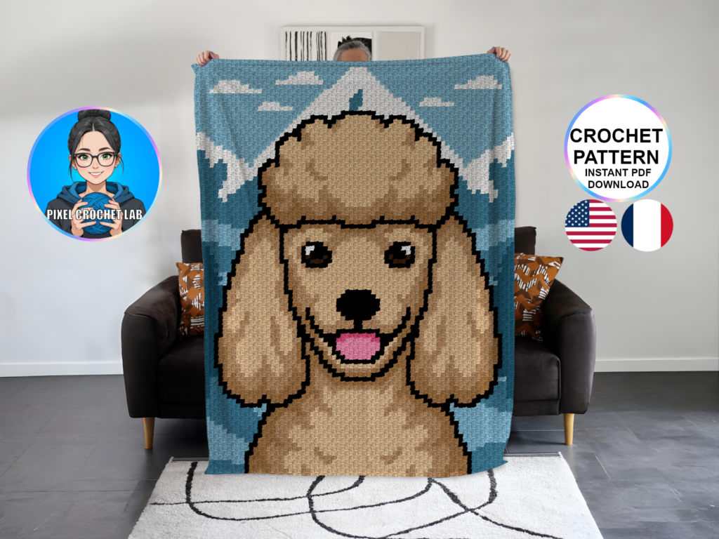 Bring elegance and sophistication to your projects with this C2C crochet blanket pattern featuring a Poodle, illustrated in pixel art within a soothing natural setting. This dog, known for its intelligence, liveliness, and endearing temperament, radiates a presence that is both refined and warm—perfect for a decorative blanket or throw with a modern style.