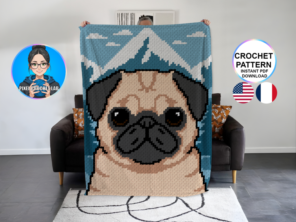 Add a touch of charm and personality to your projects with this C2C crochet blanket pattern featuring a Pug, illustrated in pixel art within a harmonious natural setting. Known for its affectionate character and endearing presence, this little dog radiates a gentle and expressive energy, perfect for a contemporary and elegant blanket or throw.