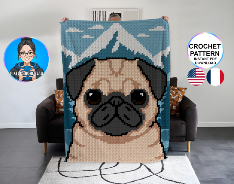 Add a touch of charm and personality to your projects with this C2C crochet blanket pattern featuring a Pug, illustrated in pixel art within a harmonious natural setting. Known for its affectionate character and endearing presence, this little dog radiates a gentle and expressive energy, perfect for a contemporary and elegant blanket or throw.