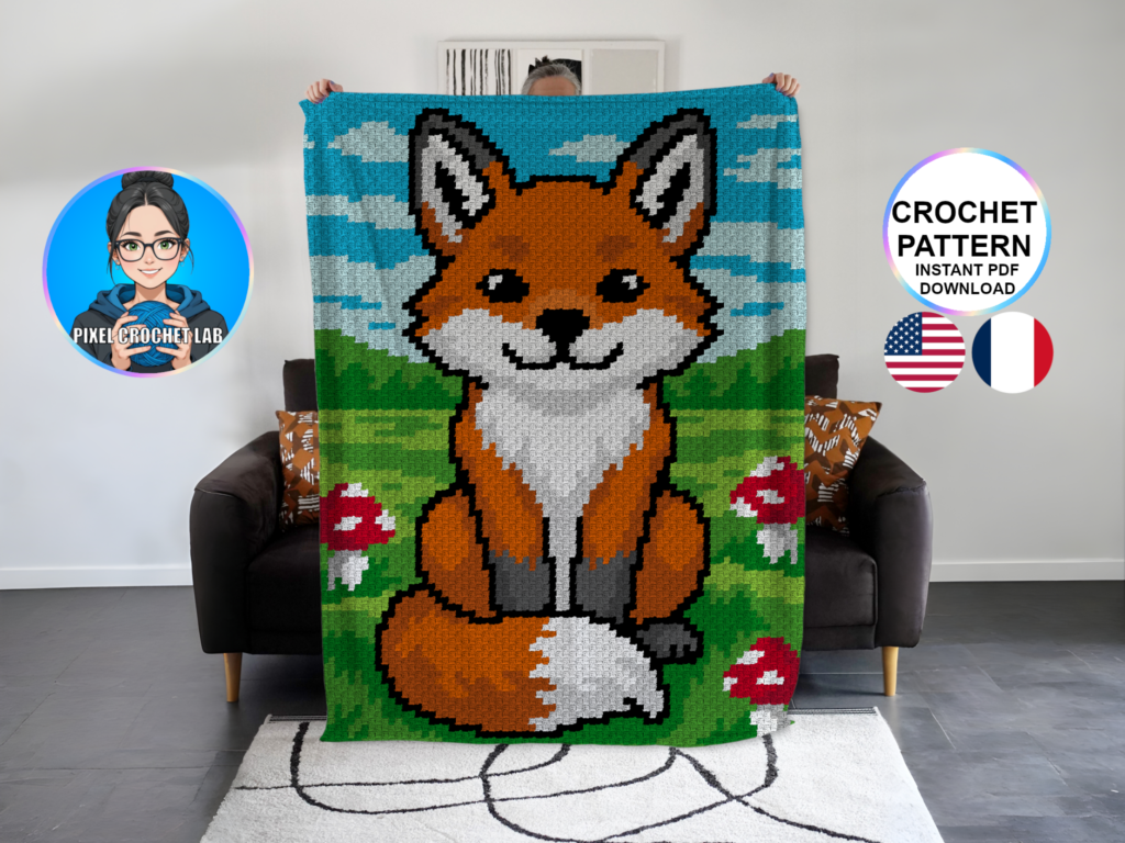 Fall in love with this charming C2C Crochet Blanket Pattern featuring an adorable red fox, depicted in pixel art within a soft and warm natural setting. Its playful gaze and vibrant colors bring a joyful and comforting touch to your creations, perfect for cozy and original crochet projects.