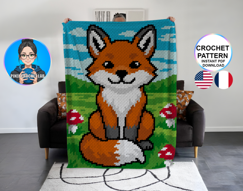 Fall in love with this charming C2C Crochet Blanket Pattern featuring an adorable red fox, depicted in pixel art within a soft and warm natural setting. Its playful gaze and vibrant colors bring a joyful and comforting touch to your creations, perfect for cozy and original crochet projects.