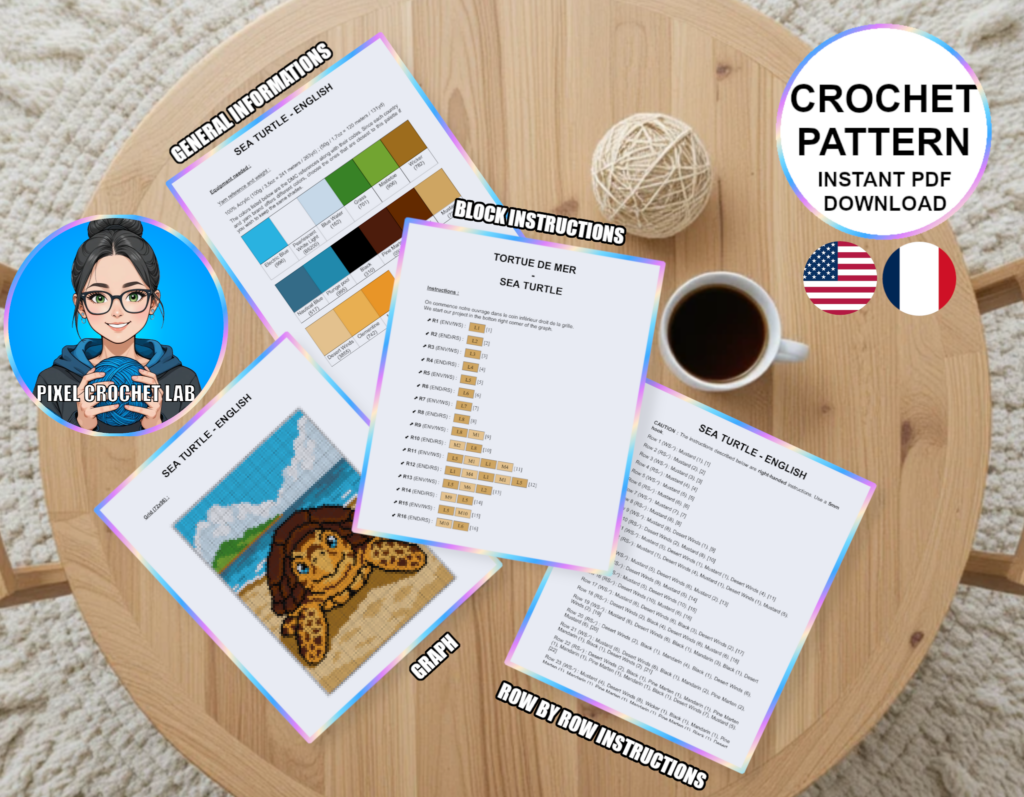 Designed to combine the joy of creation with striking visual appeal, this PDF pattern will appeal to crochet enthusiasts, ocean lovers, and pixel art fans alike. Easy to adapt in size by changing the yarn thickness, it is suitable for baby, child, or adult projects.