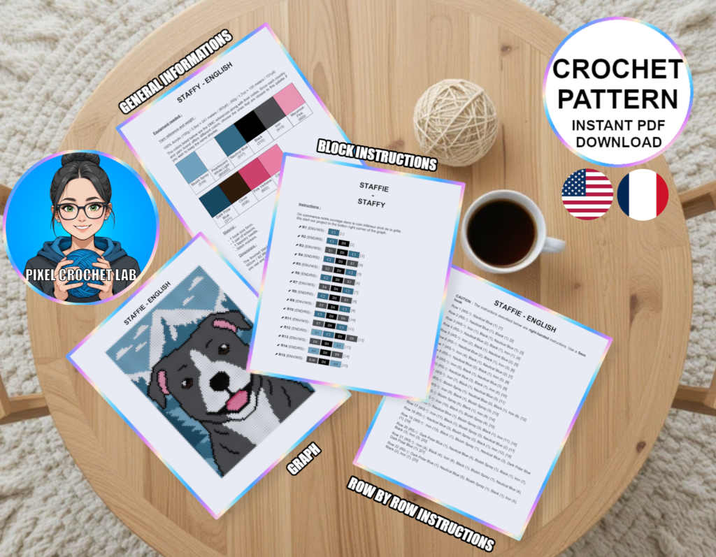 Bring softness and character to your creations with this C2C (Corner-to-Corner) crochet blanket pattern featuring a Staffy, depicted in pixel art against a majestic Nordic landscape. A symbol of courage, tenderness, and devotion, this big-hearted dog exudes a protective and warm presence, instantly adding depth and personality to the design.