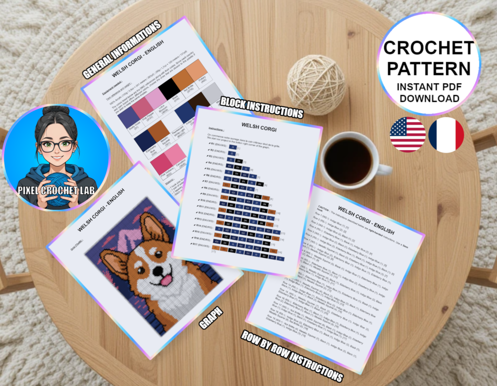 Bring a touch of magic and conviviality to your creations with this C2C (Corner-to-Corner) crochet blanket pattern featuring a magnificent Corgi, depicted in pixel art against a fairy-tale natural panorama. A symbol of joy, mischief, and faithful companionship, this irresistibly charming little dog exudes a playful presence, instantly adding a note of whimsy and softness to the design.
