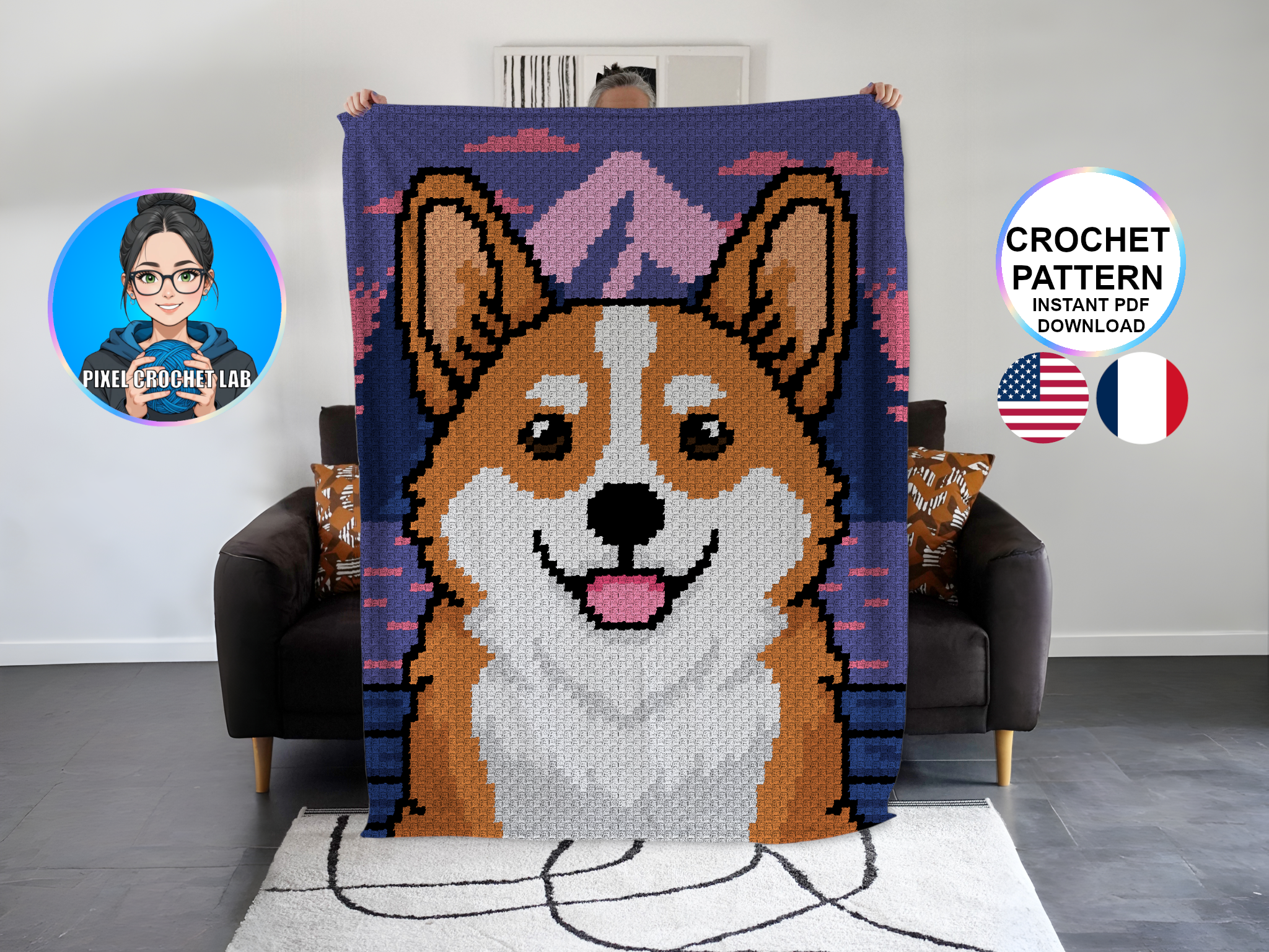 Welsh Corgi – C2C Crochet Blanket Pattern – Pixel Art Style Afghan / Graphghan – Baby, Child & Adult Blanket (PDF format) featuring a pet theme.