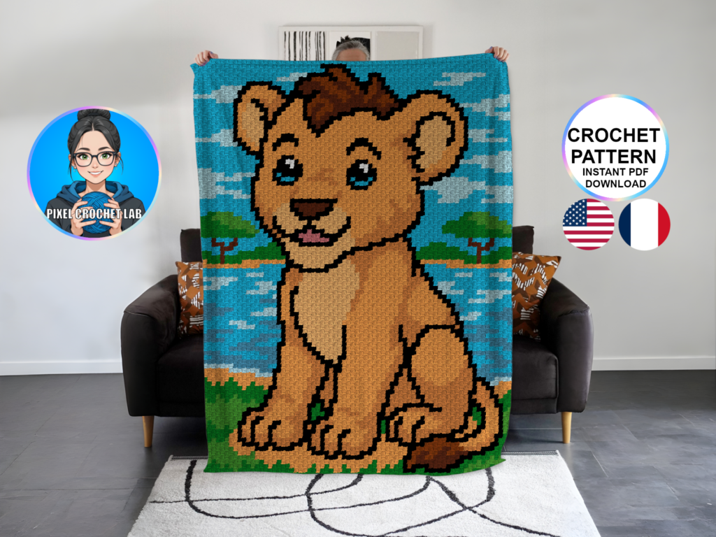 Réalisez cette magnifique couverture C2C au crochet représentant une petite lionne dans la savane. Patron PDF avec grille et instructions détaillées, parfait pour crocheteurs et crocheteuses intermédiaires.